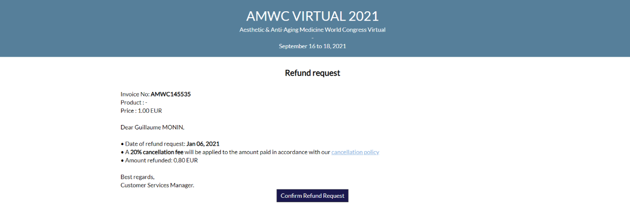• less than 30 days and up to 15 days before the first day of the relevant Event to receive a refund of 50% of the Event fees (the remaining 50% of those fees being retained by way of a processing and cancellation fee).